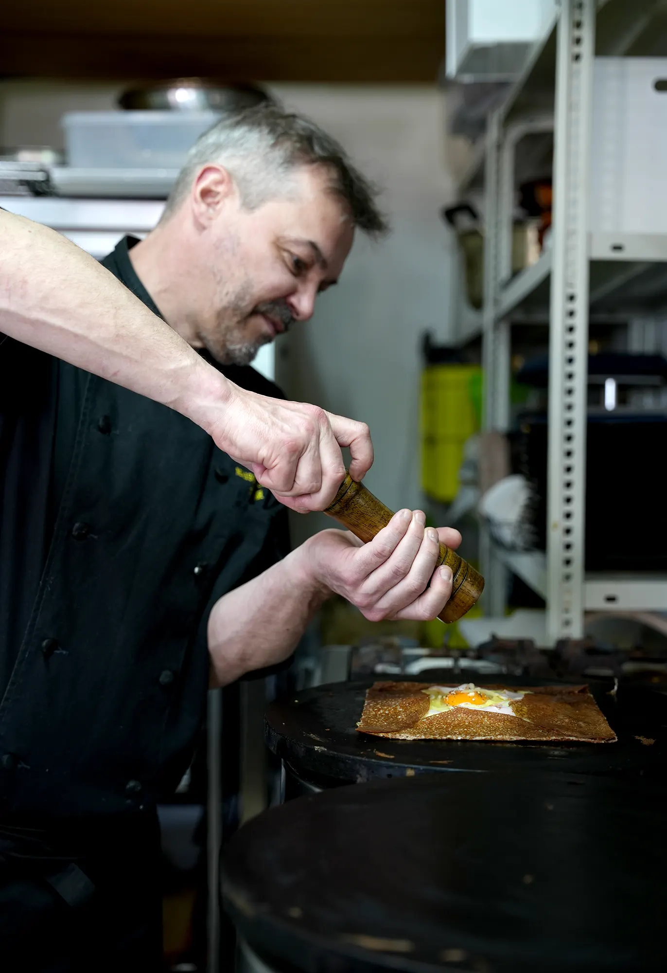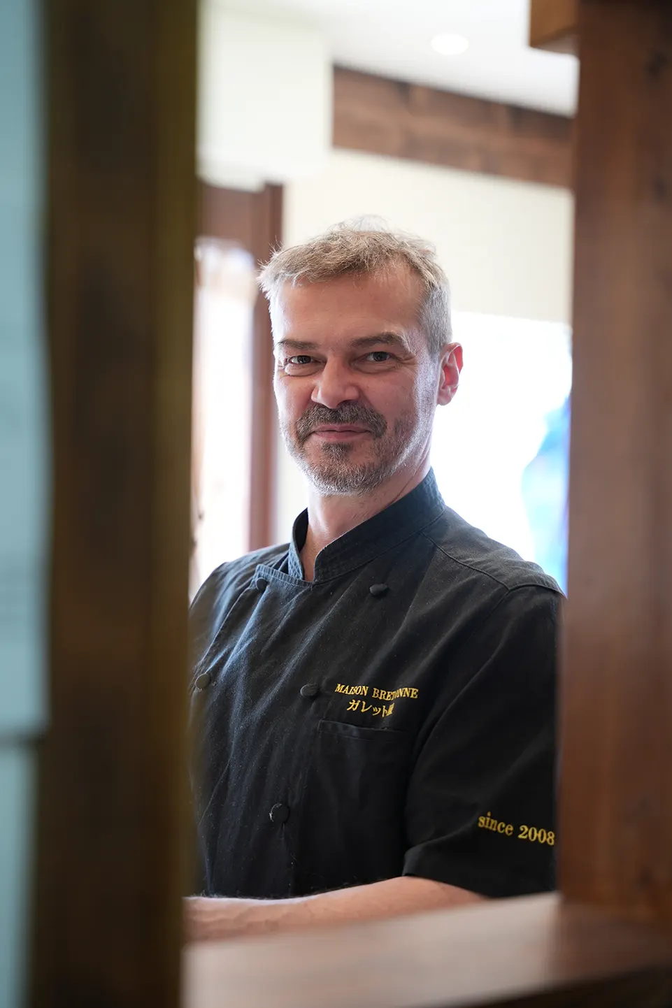 この道35年のメゾンブルトンヌ・ガレット屋のシェフです。ガレットの本場ブルターニュ出身で2000年に来日しました。8年間ブレッツカフェに勤務したのち、2008年独立し、笹塚でメゾンブルトンヌ・ガレット屋をオープン!14年間営業しました。