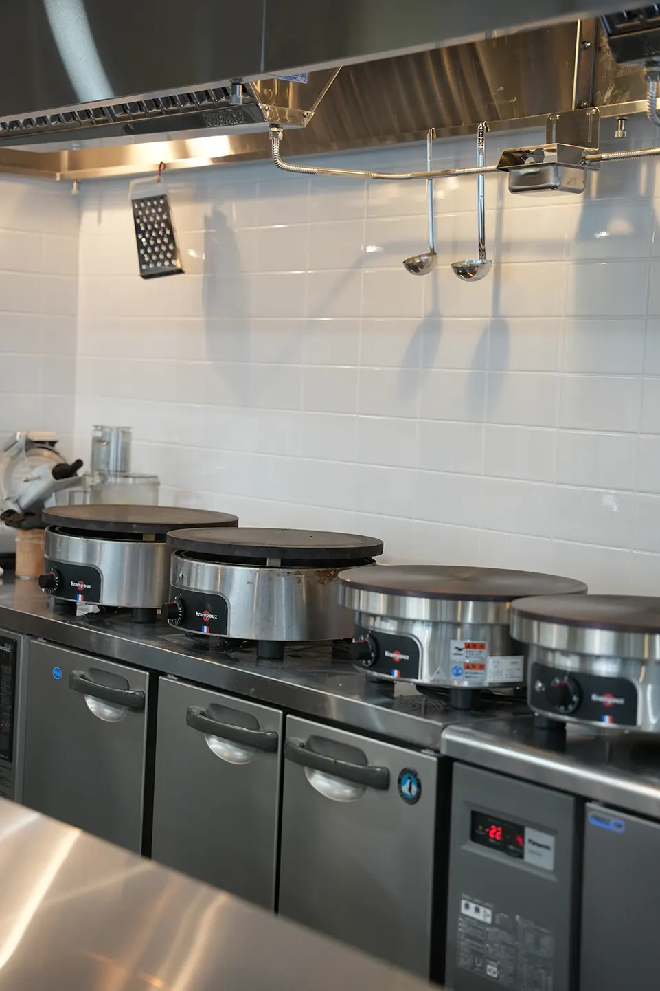 東京・東小岩に位置する当校は、明るく開放的な 115㎡のスペース を誇ります。オープンキッチンでは実際のサービスに近い環境で学ぶことができ、また交流のためのコーナーも備えており、受講生同士が自然に語り合い、アイディアを共有できる場となっています。SKOL は単なる技術習得の場ではなく、ガレットを通じた出会いと創造の場でもあります。